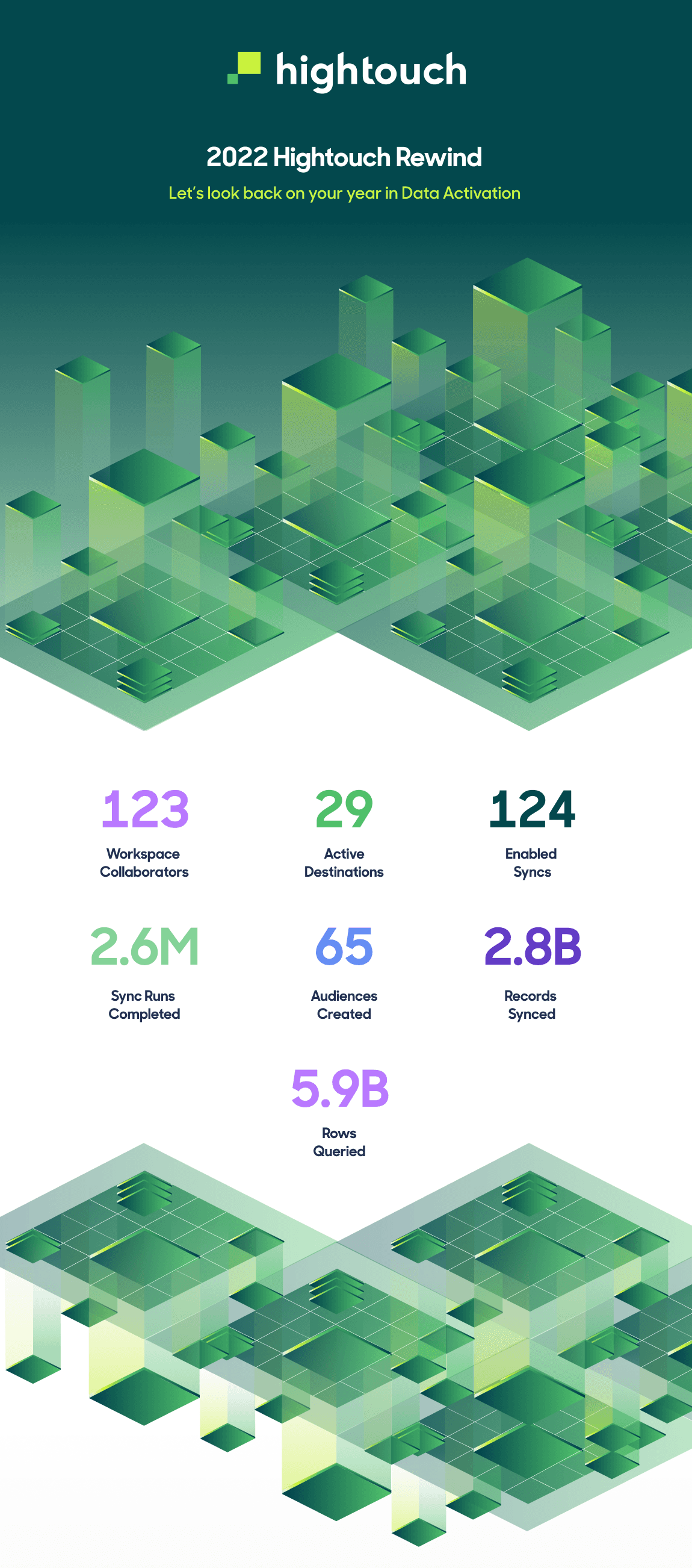 Halls are decked, cheer is spread, resolutions are…drafted (?!). And one more thing: it wouldn’t be a proper end-of-year reflection without a lookback blog post. Just today, we sent out an email to our customers titled ️⭐️ 2022 in Review: Your Year with Hightouch which consolidates all of their data activation stats and use cases into a shareable infographic.