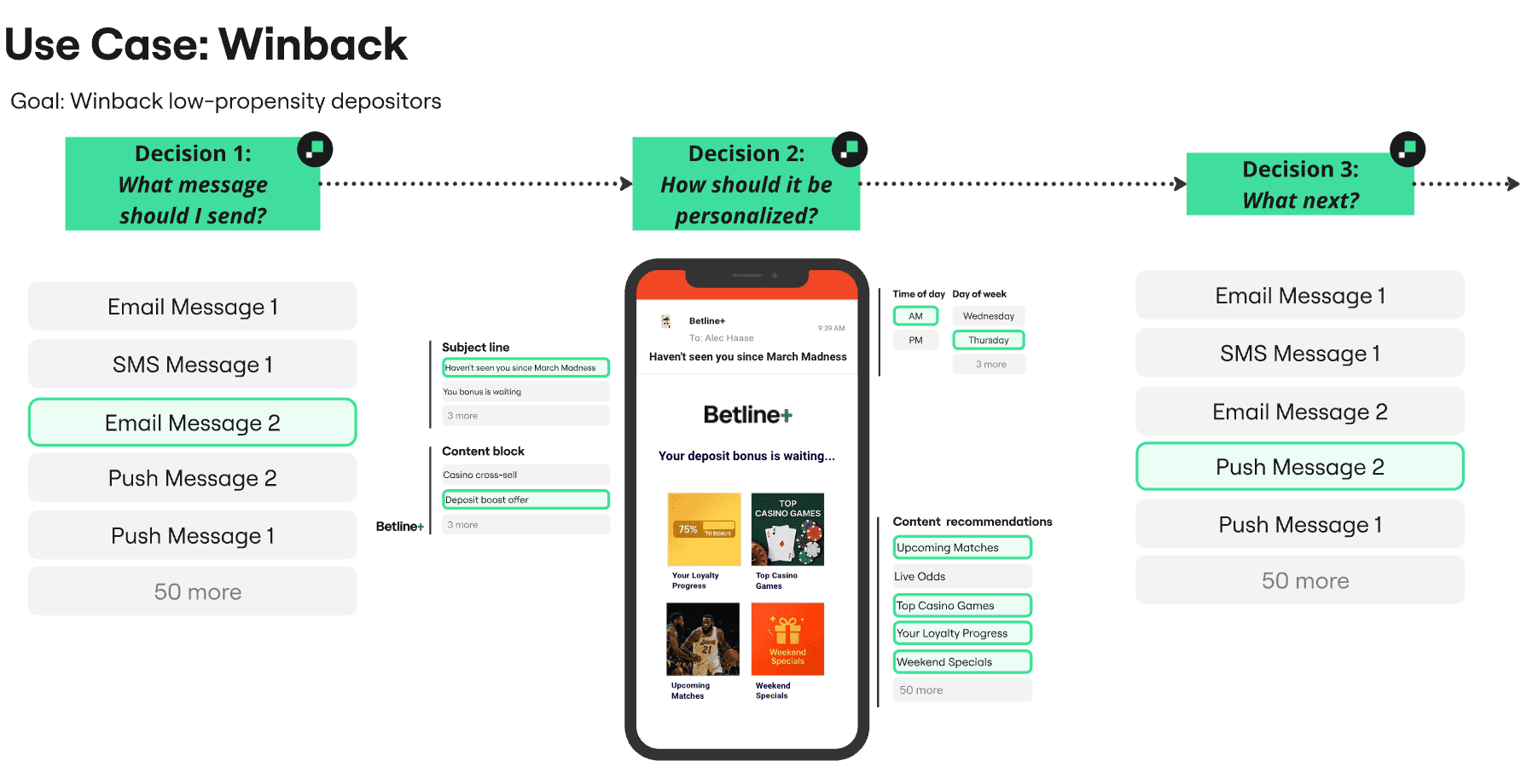 - VIP retention: A high-value casino player suddenly disengages. Do we surface tailored high-stakes offers, shift to email for more exclusive messaging, or reduce outreach to protect long-term loyalty?