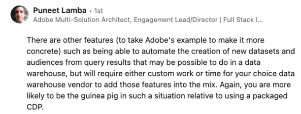 One of the comments (excerpt below) on my post last week questioned whether Composable CDPs were legitimate technologies relative to packaged CDPs:
