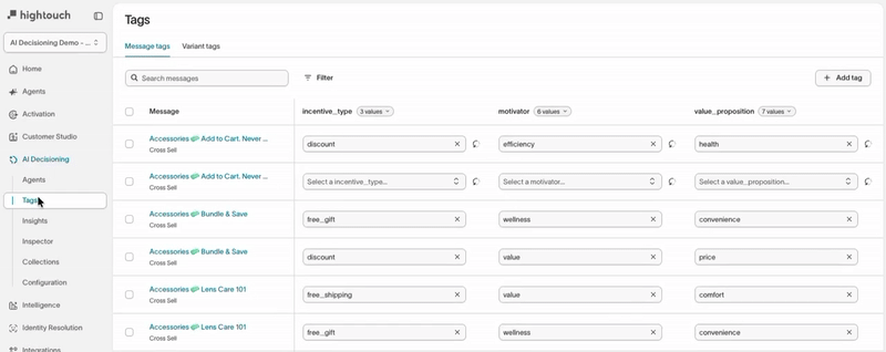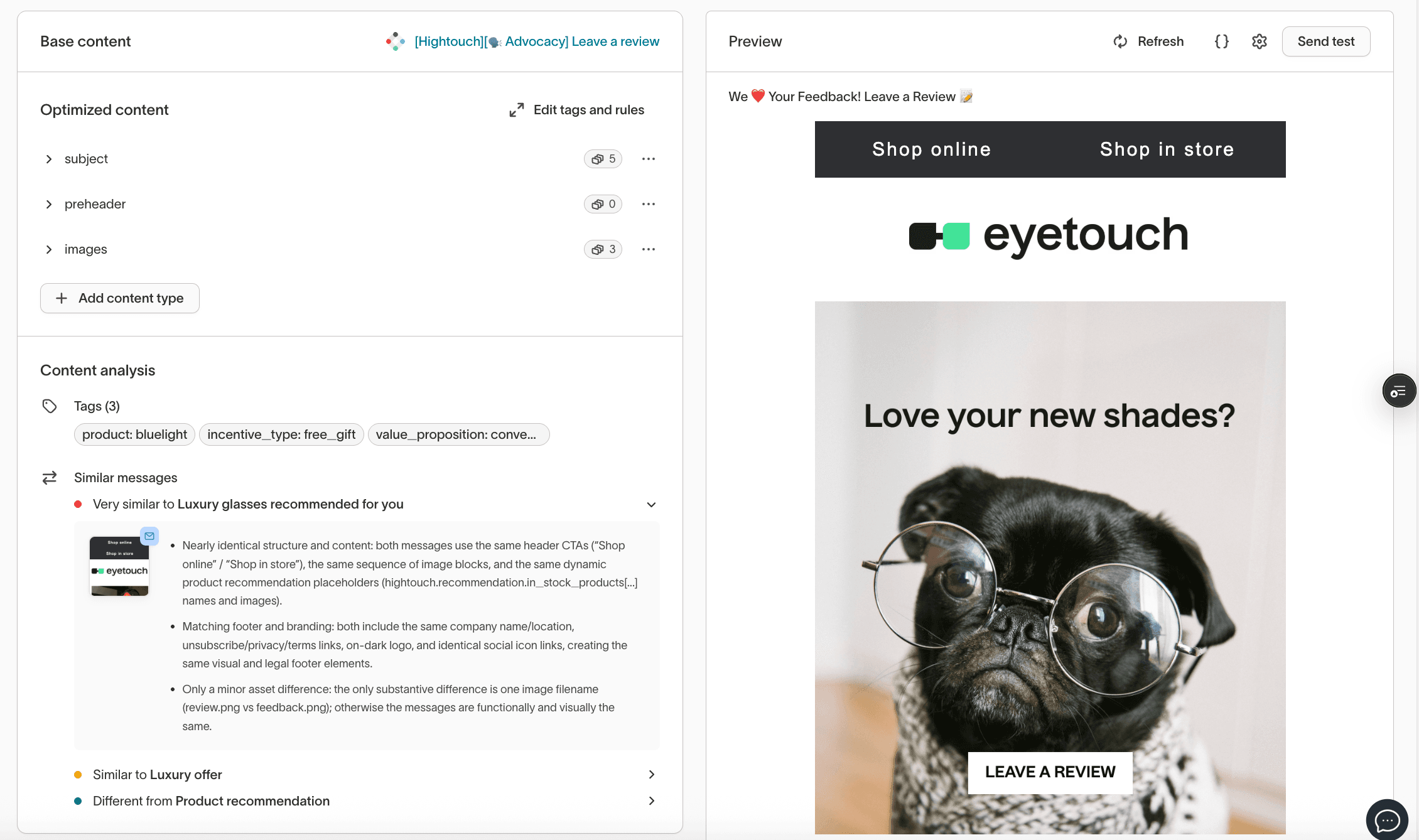 Hightouch automatically tags every message, creating a structured content library that AI can analyze and compare.