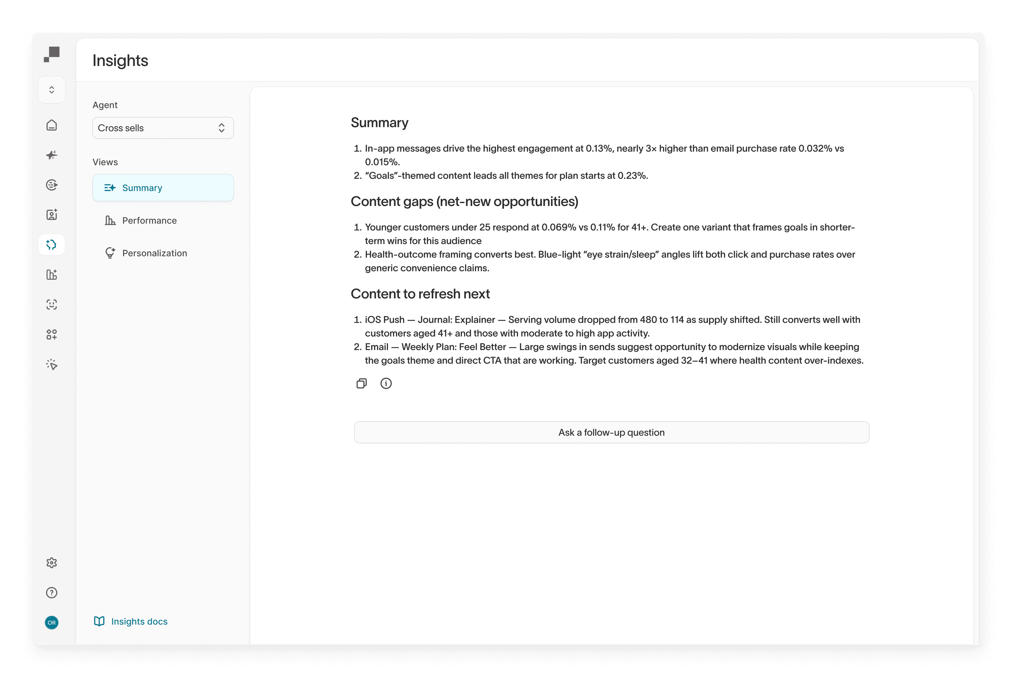 The new way: AI Decisioning proactively surfaces underperforming groups due to a lack of relevant content. It makes intelligent recommendations: “Gift-buyers with minimal site history respond best to curated, product-centric content. Your 'Top 10 Holiday Gifts' message already drives 3.4% conversion for this group, so add 2–3 occasion-based guides to capture more of these high-intent shoppers." New content can then be immediately activated by AI Decisioning to reach those segments.