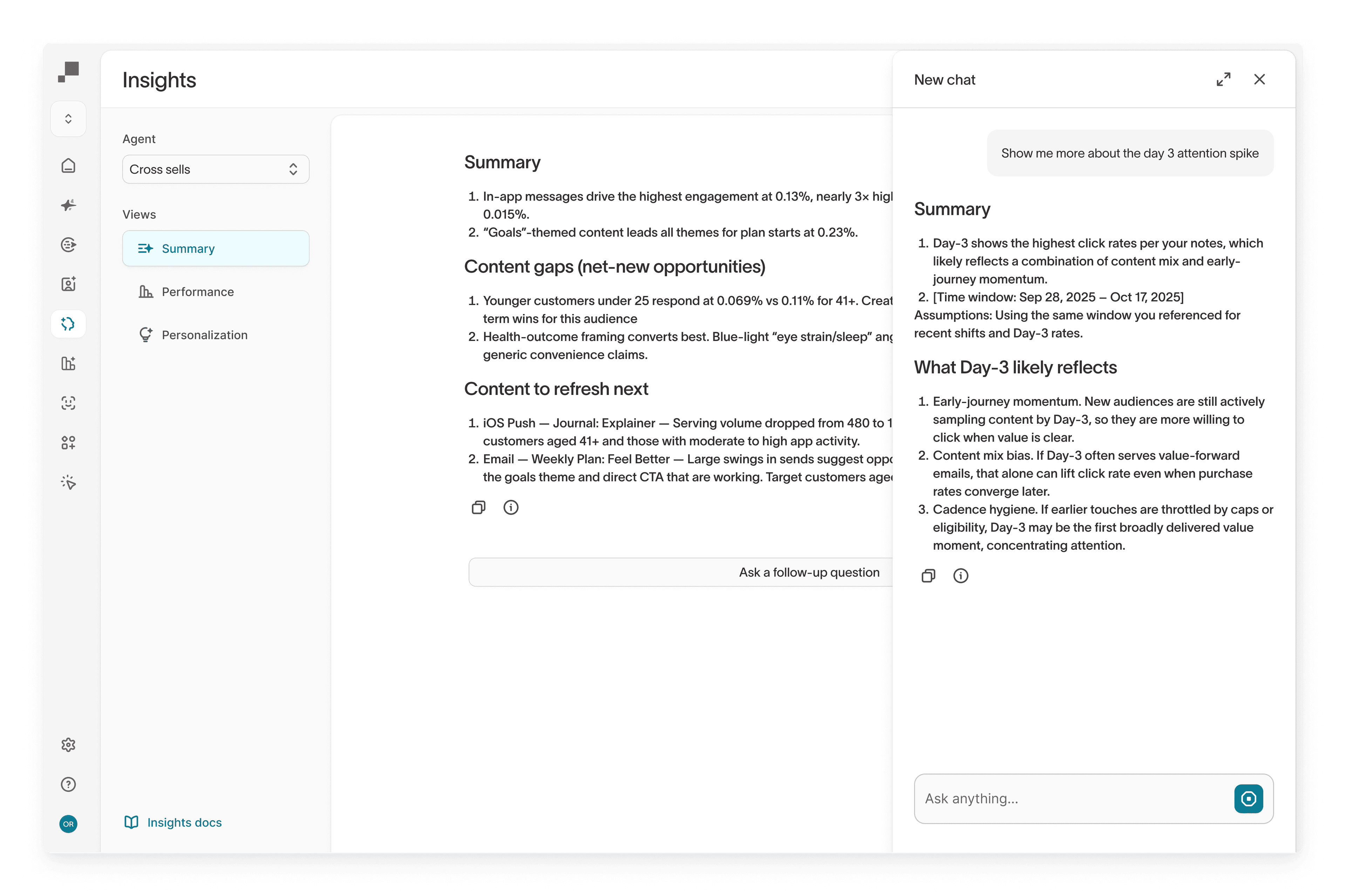 Hightouch Agents surface the answer, explain what's driving the pattern, and connect it to your content strategy. Each response opens the door to follow-up questions, letting you dig deeper to better understand the recommendations. This transforms static dashboards into an ongoing conversation where you can follow interesting trends, test hypotheses, and uncover opportunities as they emerge.