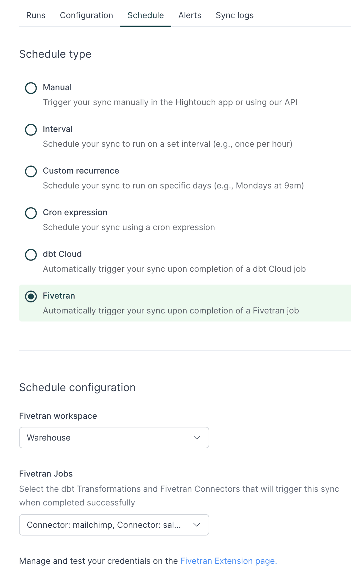 Hightouch sync configuration with Fivetran schedule option