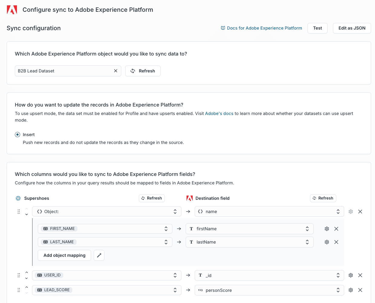 The Hightouch AEP destination sync uses Adobe’s AEP Import API. Once a user is authenticated, the Hightouch sync configuration can be used to map data warehouse fields to AEP fields: