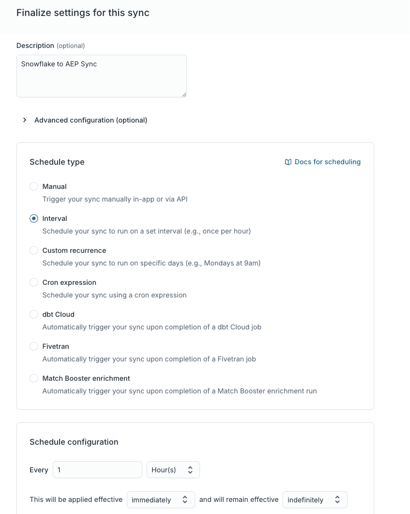 The sync between the warehouse and AEP can be performed manually or scheduled at specific intervals.