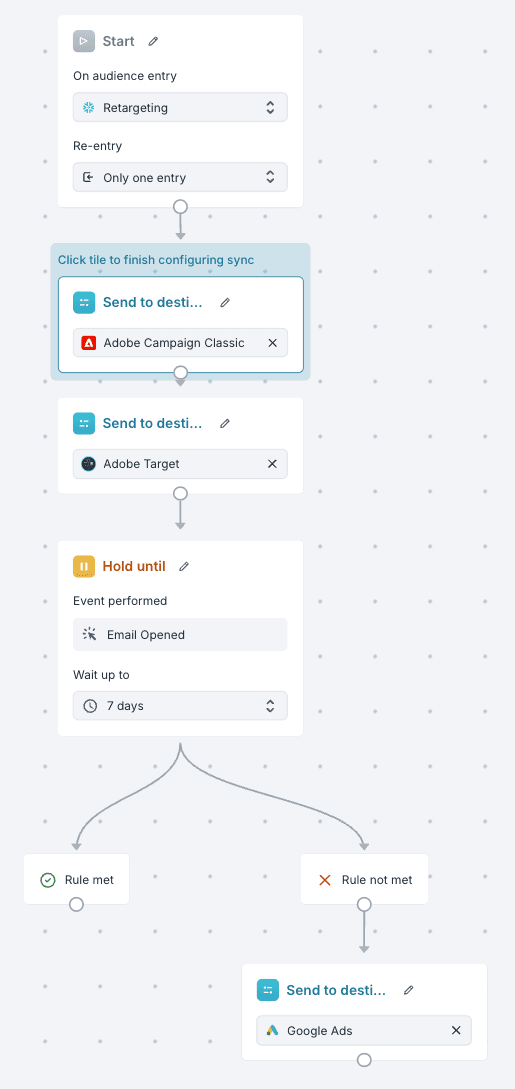 While creating messaging journeys in Adobe Campaign can be powerful, you may want to extend user journeys beyond the confines of Adobe Campaign. For example, if you email a set of users and they don’t respond, you may want to target them through digital advertising subsequently. Unfortunately, Adobe Campaign journeys don’t allow you to go beyond messaging. But Hightouch Journeys enables you to build omnichannel user journeys encompassing messaging and advertising. Hightouch Journeys acts like an orchestration layer and tells Adobe Campaign who should be included in each messaging campaign and which users should be sent to advertising networks.