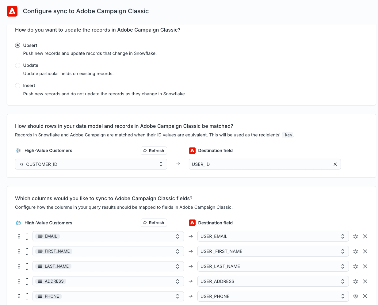 In this example, a series of data points, including email, name, address, and phone number, are updated in Adobe Campaign using data from Snowflake.