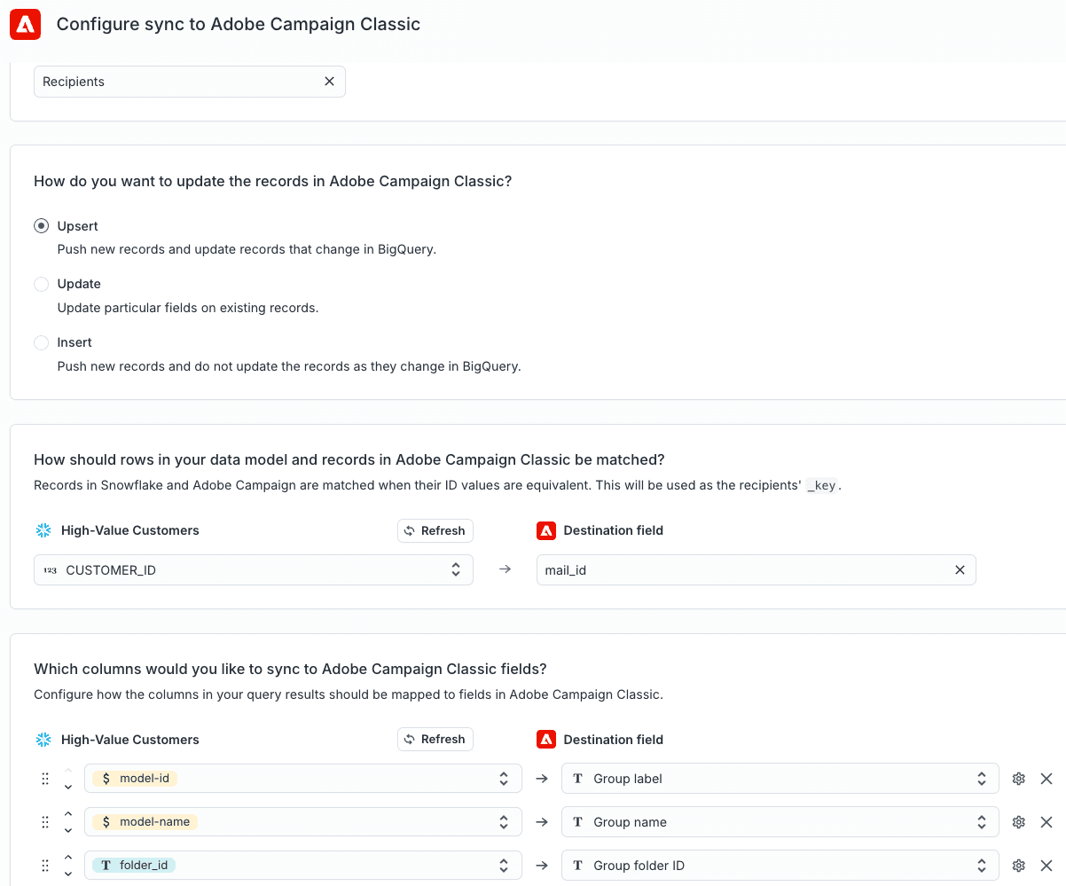 In addition to sending audiences to Adobe Campaign, you can update Adobe Campaign user profile attributes via Hightouch. Hightouch can update any attribute in Adobe Campaign with the complete and newest information in the data warehouse. Hightouch pushes these updates via a sync, just like it does to push new audiences into Adobe Campaign, which links recipient data in the warehouse and Adobe Campaign through a common user identifier.