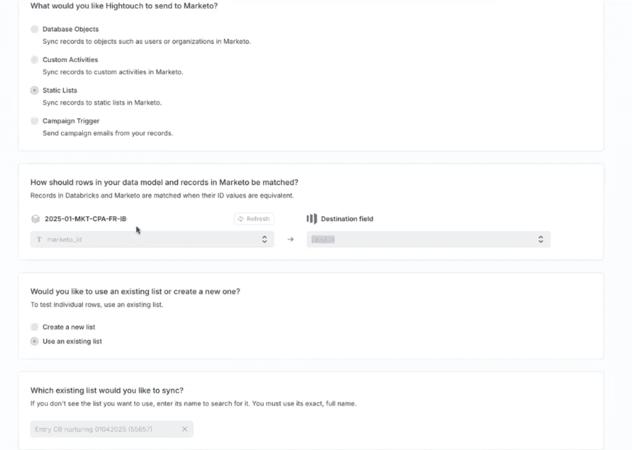 Audiences created in Hightouch can be sent to Marketo manually, scheduled, or based on event triggers. Here is an example of an audience in Databricks being sent as a static list to Marketo: