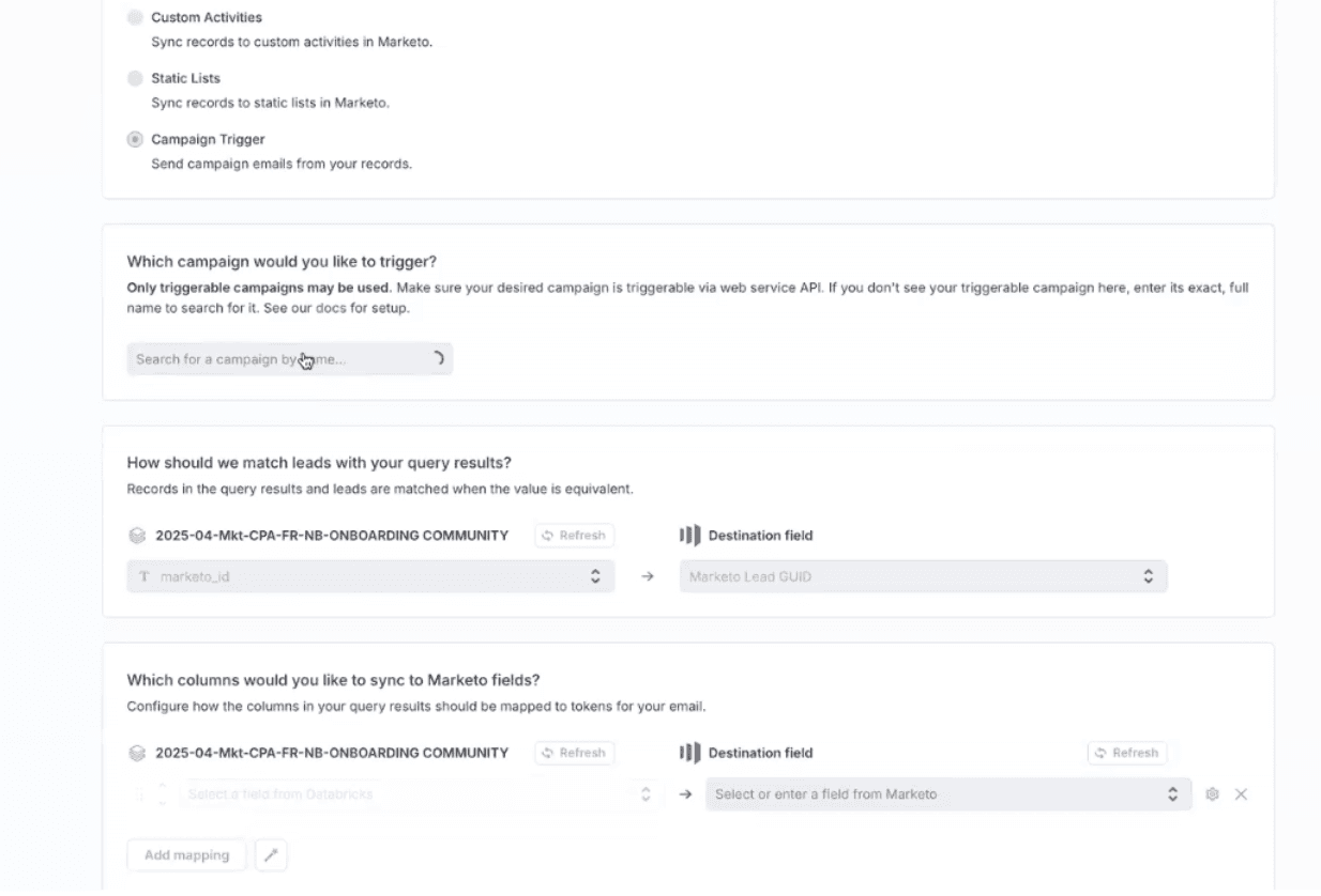 Hightouch can also be used to trigger Marketo campaigns proactively. You can use Hightouch’s Campaign Triggers sync to Marketo to initiate a sync when a specific event occurs or a particular data point changes in the warehouse. You can also send specific attributes with the trigger to personalize the actions or content performed/sent by Marketo.