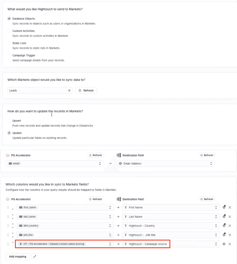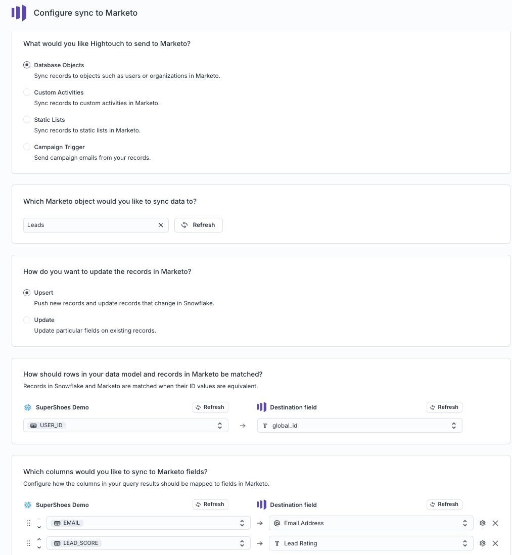 Hightouch excels at syncing data from cloud data warehouses into downstream destinations, and Marketo is one of our most popular destinations. While it’s possible to import data from cloud data warehouses into Marketo manually, it can be complicated and cumbersome for your data teams.