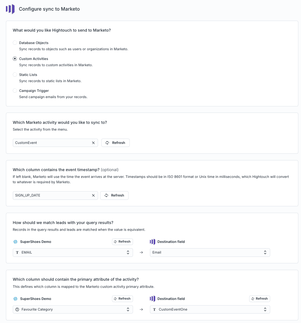 Lastly, Hightouch can create custom Marketo Activities based on events viewed in the data warehouse. The Hightouch Custom Activity option allows you to generate Marketo activities automatically. These custom activities can include in-app usage tracking, video engagement tracking, lead scoring, sales alerts, churn risk indicators, physical event check-ins, etc.