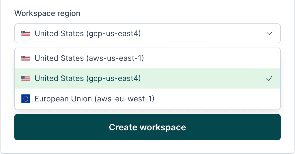 When you set up a new workspace, you’ll be prompted to select your region. You’ll find gcp-us-east4 in the drop down. (Note that once your workspace has been created, the region cannot be changed.)
