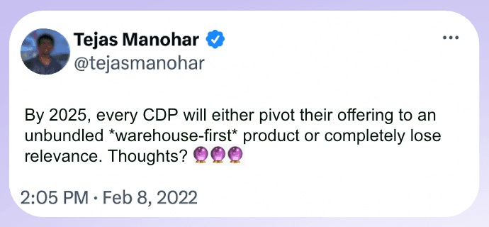 But saying you are a Composable CDP is very different from being a Composable CDP! I experienced this about a month ago when a product marketer from Adobe responded to a post of mine claiming that their packaged CDP (Adobe RT-CDP) was a Composable/zero-copy CDP (see full conversation here). Packaged CDP vendors have begun marketing themselves as integrating into cloud data warehouses, but we haven't seen much of this in the wild. Employees may claim they can do it, but haven’t provided documentation about it - at least so far.