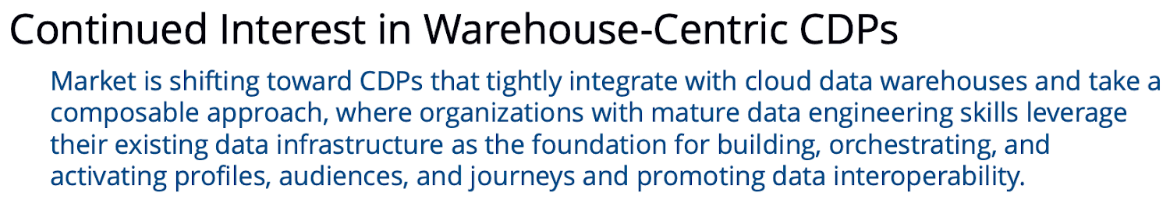When the Composable CDP disruption first began, incumbent legacy/packaged CDP vendors and analysts attempted to portray the Composable CDP movement as a “fad.” Industry analysts didn't include Composable CDPs in vendor scorecards. But, as more organizations understand the benefits of a composable (sometimes called “zero-copy”) approach to CDPs, the composable architecture is only gaining steam and forcing legacy/packaged CDPs to scramble for answers. How do I know this? By the fact that legacy packaged CDP vendors are now attempting to market their products as Composable CDPs or Composable CDP hybrids (e.g., Salesforce, Adobe, Tealium, Treasure Data)! Market research organizations like IDC have also cited this industry shift: