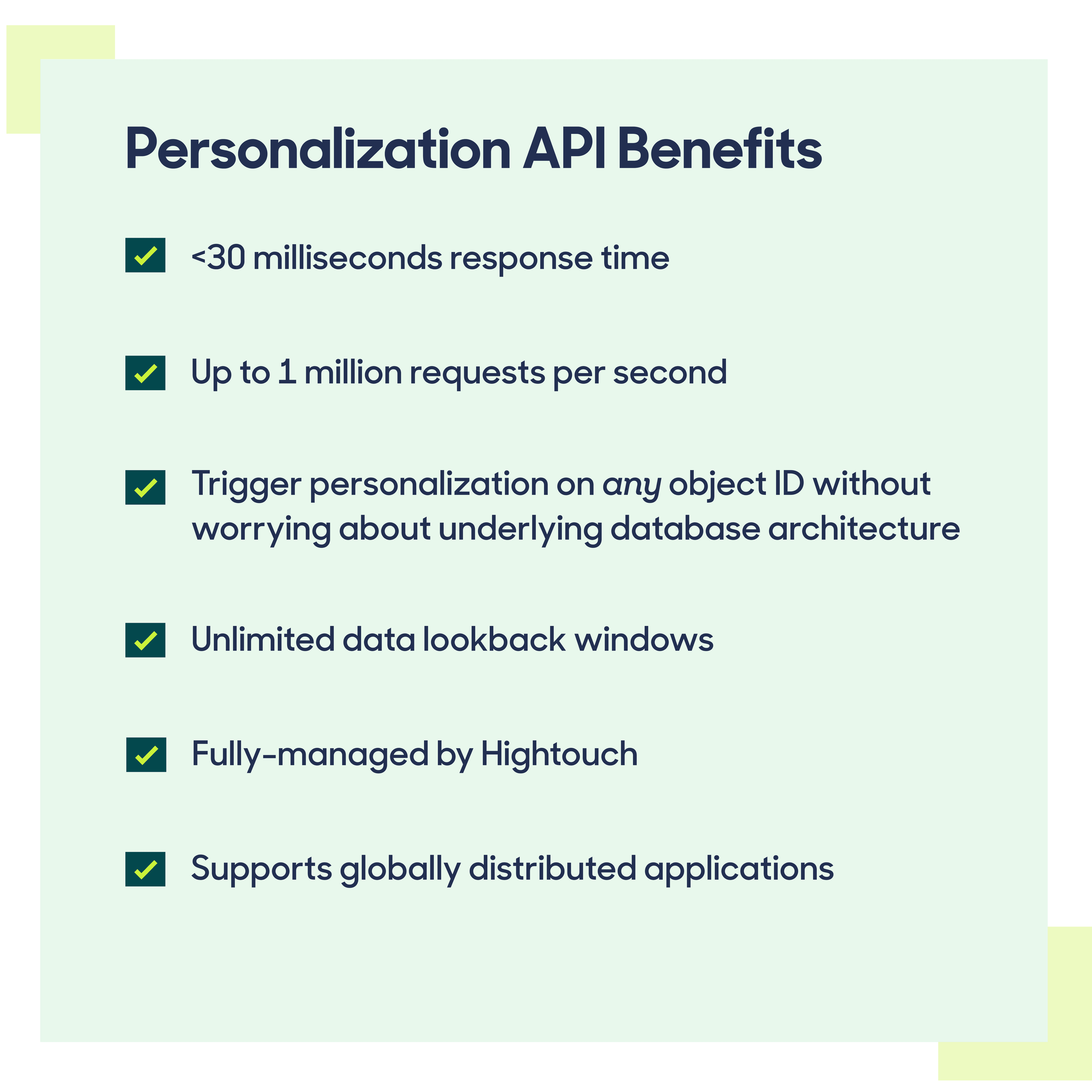 The Hightouch Personalization API is available as an additional feature for Business Tier customers today. Learn more here, or reach out to your sales rep to get started.