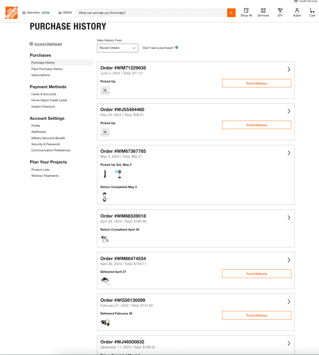 If I look at my Home Depot account, I can see products I have purchased in the past: