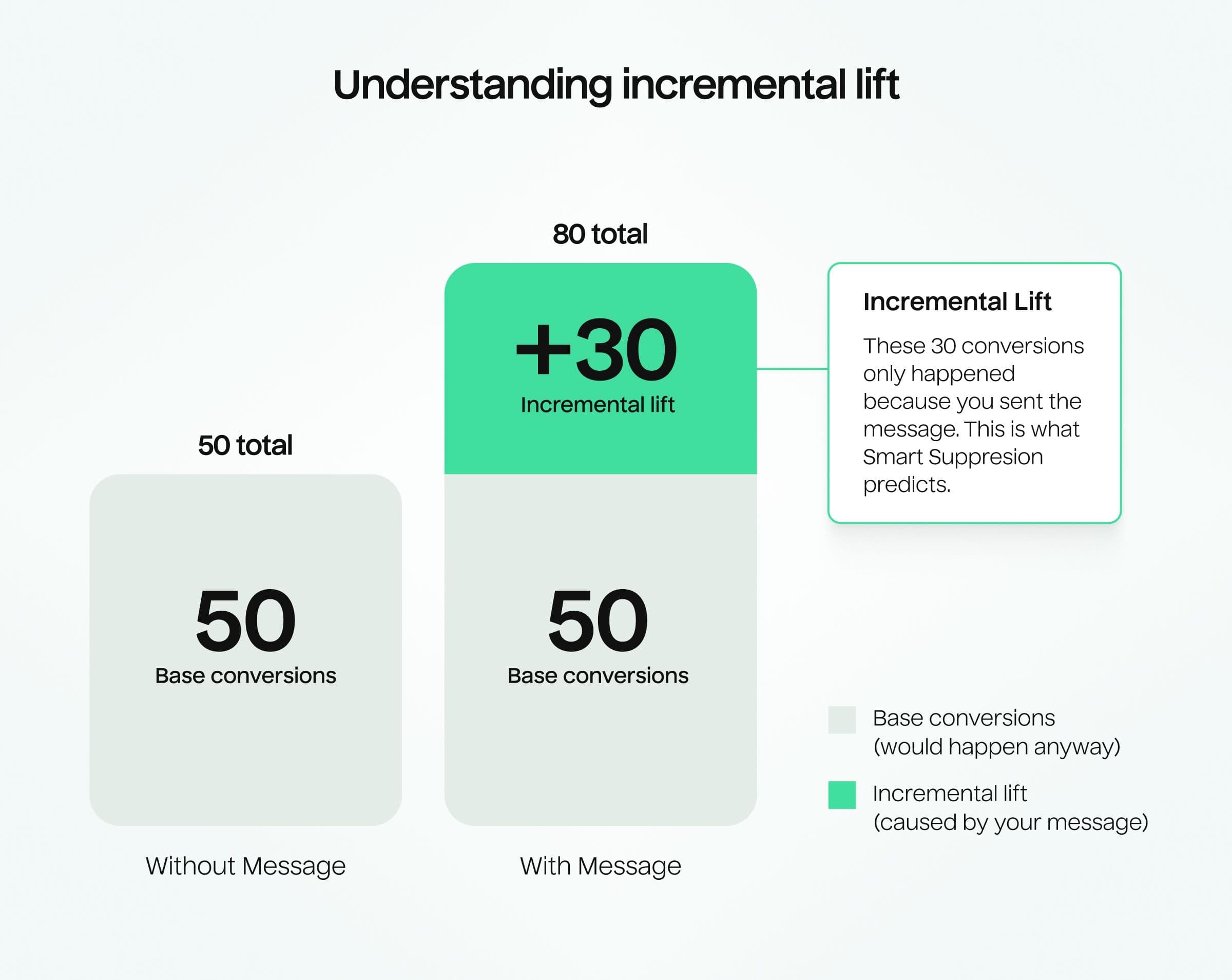Incremental lift is the impact that a message will have because you sent the message. It’s a measure of the difference in conversion likelihood due to your marketing. Not all messages create incremental lift: Some drive conversions, while others maintain engagement and build relationships. Some messages won’t create impact regardless of how great they are.