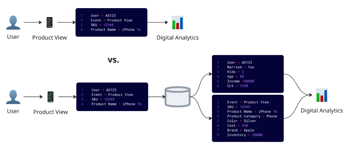 For example, let’s say that Adam is logged into an eCommerce website and looks at a mobile phone. In a digital analytics context, that would constitute a “Product View” event and have an associated property of the SKU of the product viewed. This data could easily be collected by a digital analytics product tag and sent directly to the digital analytics product. However, if this event were sent to the data warehouse, additional information about Adam could be sent to the digital analytics product. The data warehouse may know where Adam lives, if he is married, how many kids he has, his household income, and his lifetime value. All of this information could be passed with the event to improve the types of digital analyses that can be conducted. And because this information isn’t being exposed to code debuggers, it can even include PII if your privacy and legal teams allow it.