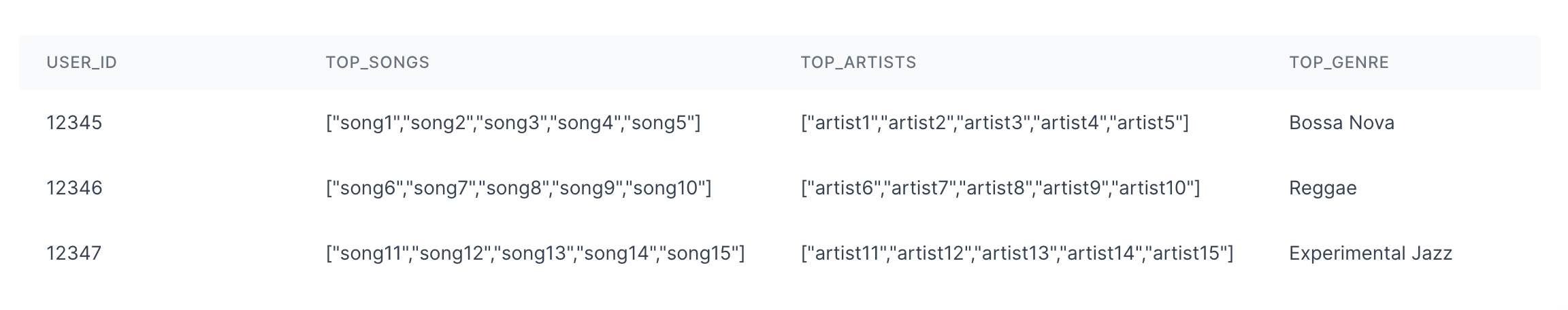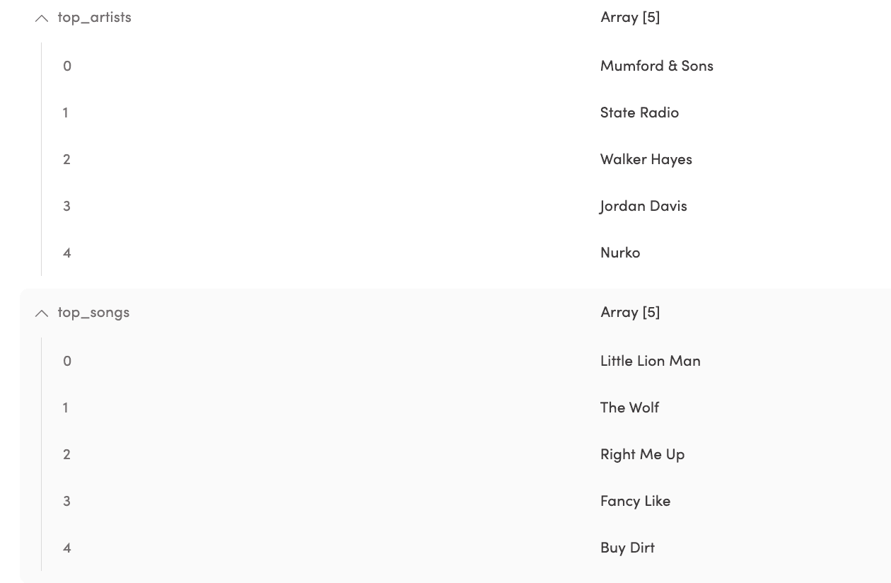 Your final model should come out looking something like this with the specific songs and artists nested inside of top_songs and top_artists objects
