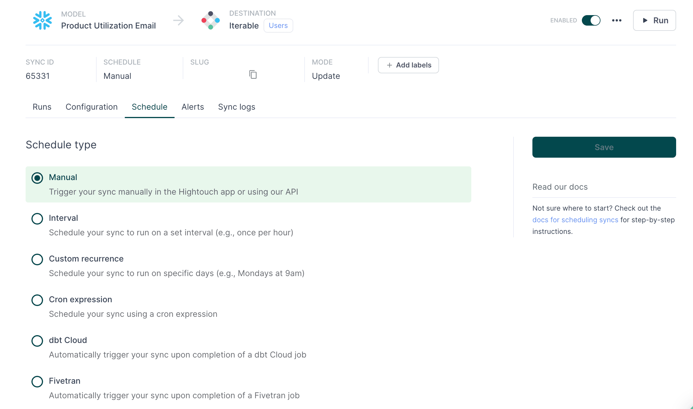 In this case, we will only run the sync once manually. If we wanted to update it on a recurring schedule (ex. a weekly or monthly campaign), Hightouch allows us to do that as well.