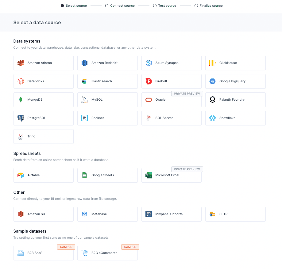 Hightouch supports a variety of data warehouses as sources, but for this example, let's assume Snowflake is being used. If your source has not already been configured, navigate to sources, then select your source and input your credentials.